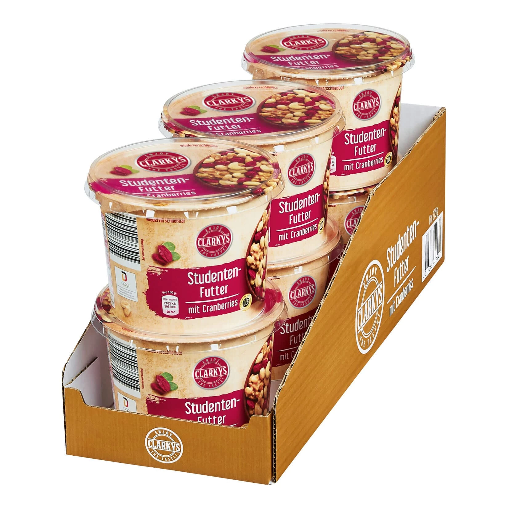 Nuss-Fruchtmischung aus getrockneten und gezuckerten Cranberries, Erdnusskernen, Cashewkernen, Mandeln und Walnusskernen.