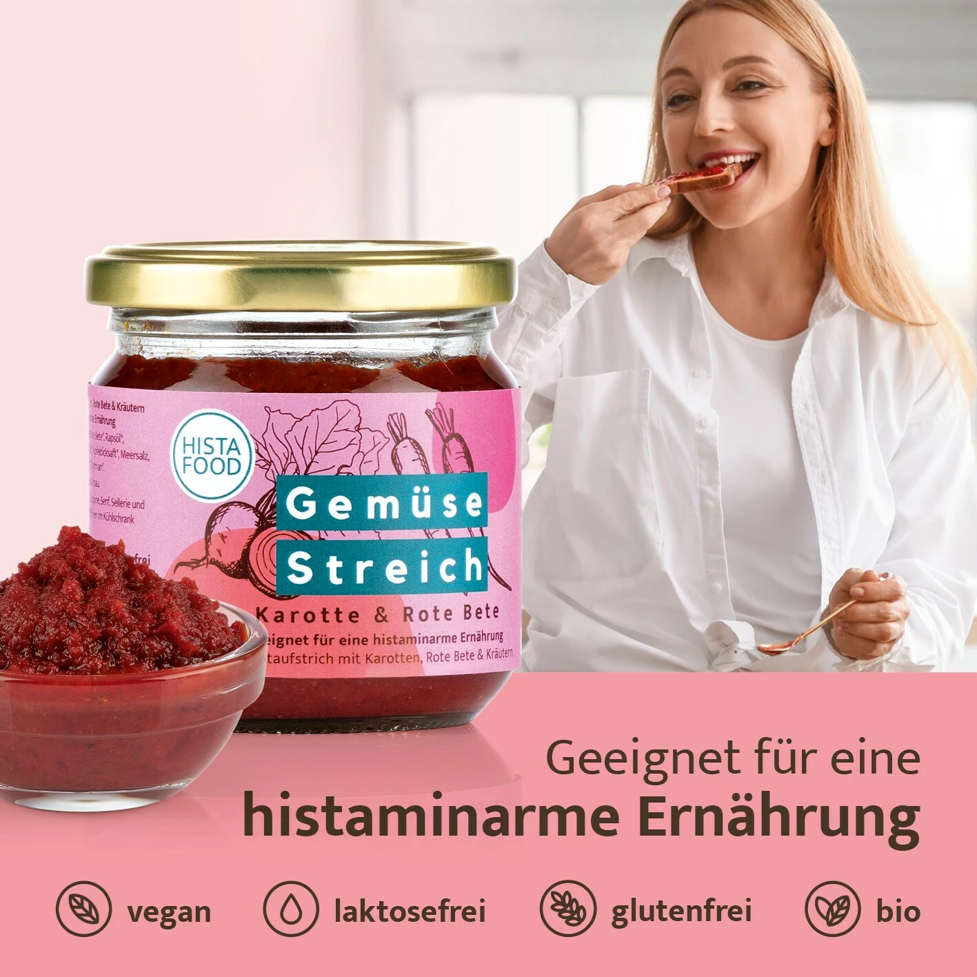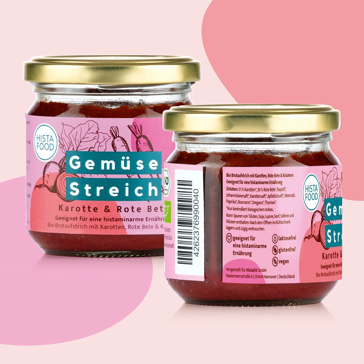 Sättigend, praktisch und echt lecker! Mit dem HistaFood GemüseStreich erhältst du endlich eine verträgliche Alternative zu histaminreichen Lebensmitteln. Und dabei musst du nicht auf exzellenten Geschmack und feinste Zutaten verzichten: Der reichhaltige Brotaufstrich kommt in bester Bioqualität und mit saftigen Karotten, feiner Rote Beete und würzigen Kräutern. Ob zum Frühstück, Abendbrot oder als Snack für zwischendurch: HistaFood ist dein GemüseStreich, der dich bei deiner Histaminintoleranz begleitet. Probiere es aus und erlebe die perfekte Alternative zu histaminreichen Aufstrichen. Köstlich auf frischem Körnerbrot.