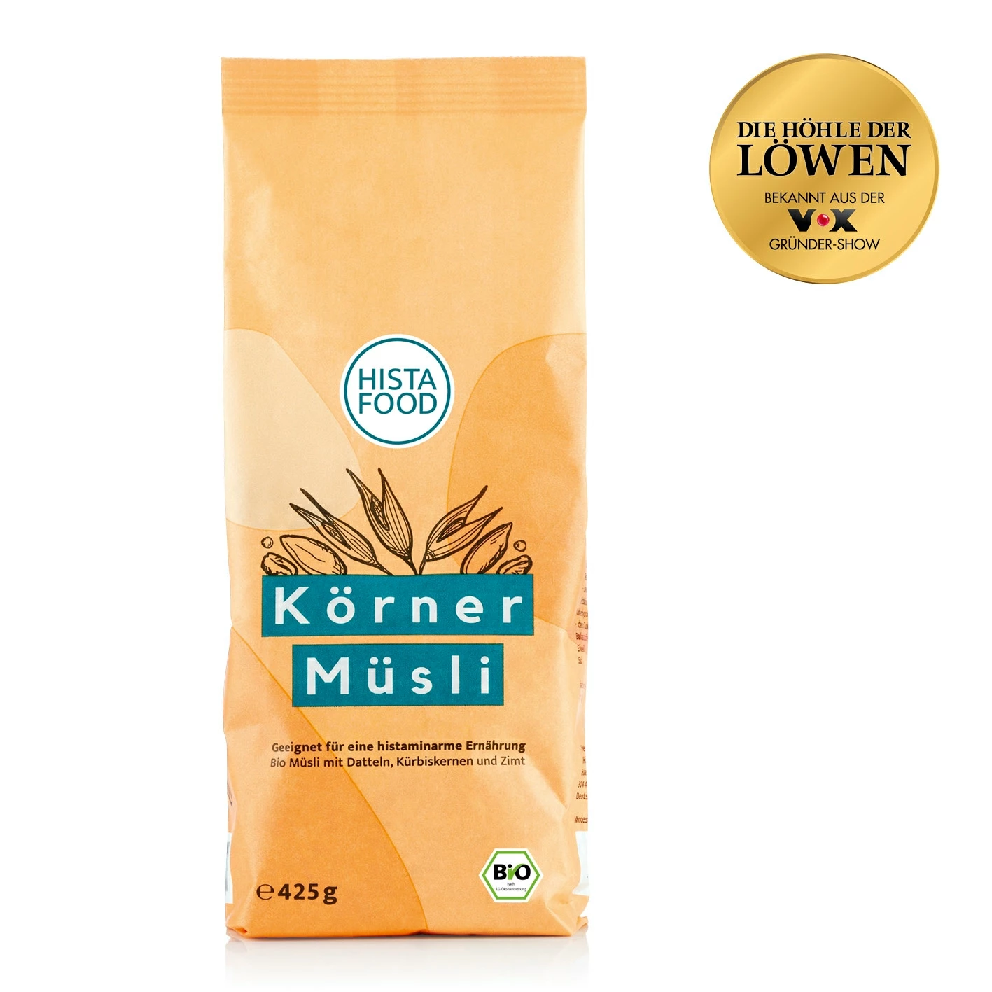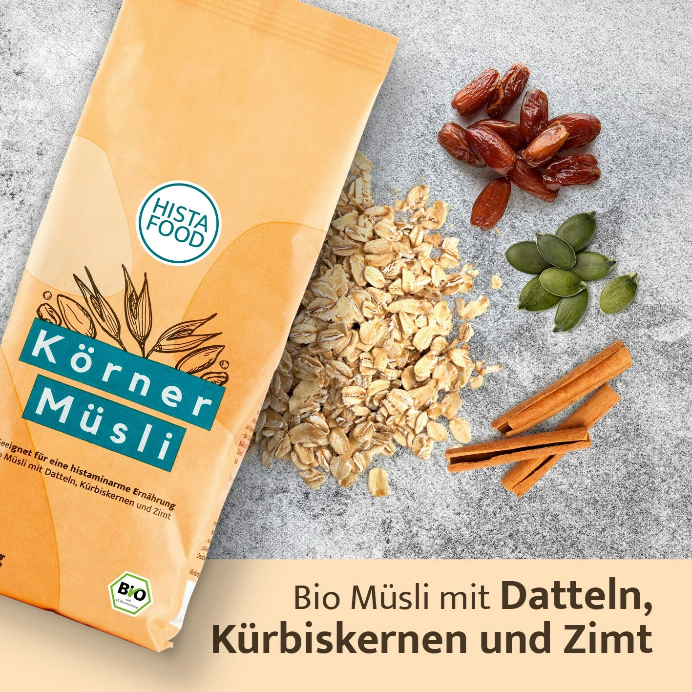 Sättigend, praktisch und echt lecker! Mit dem HistaFood KörnerMüsli erhältst du endlich eine verträgliche Alternative zu histaminreichen Lebensmitteln. Und dabei musst du nicht auf exzellenten Geschmack und feinste Zutaten verzichten: Das reichhaltige Müsli kommt in bester Bio-Qualität und mit saftigen Datteln und Kürbiskernen sowie einer angenehmen Zimtnote. Ob zum Frühstück oder als Snack zwischendurch: HistaFood ist dein Bio-Müsli, das dich bei deiner Histaminintoleranz begleitet. Probiere es aus und erlebe einen histaminarmen Snack, der es ordentlich in sich hat.