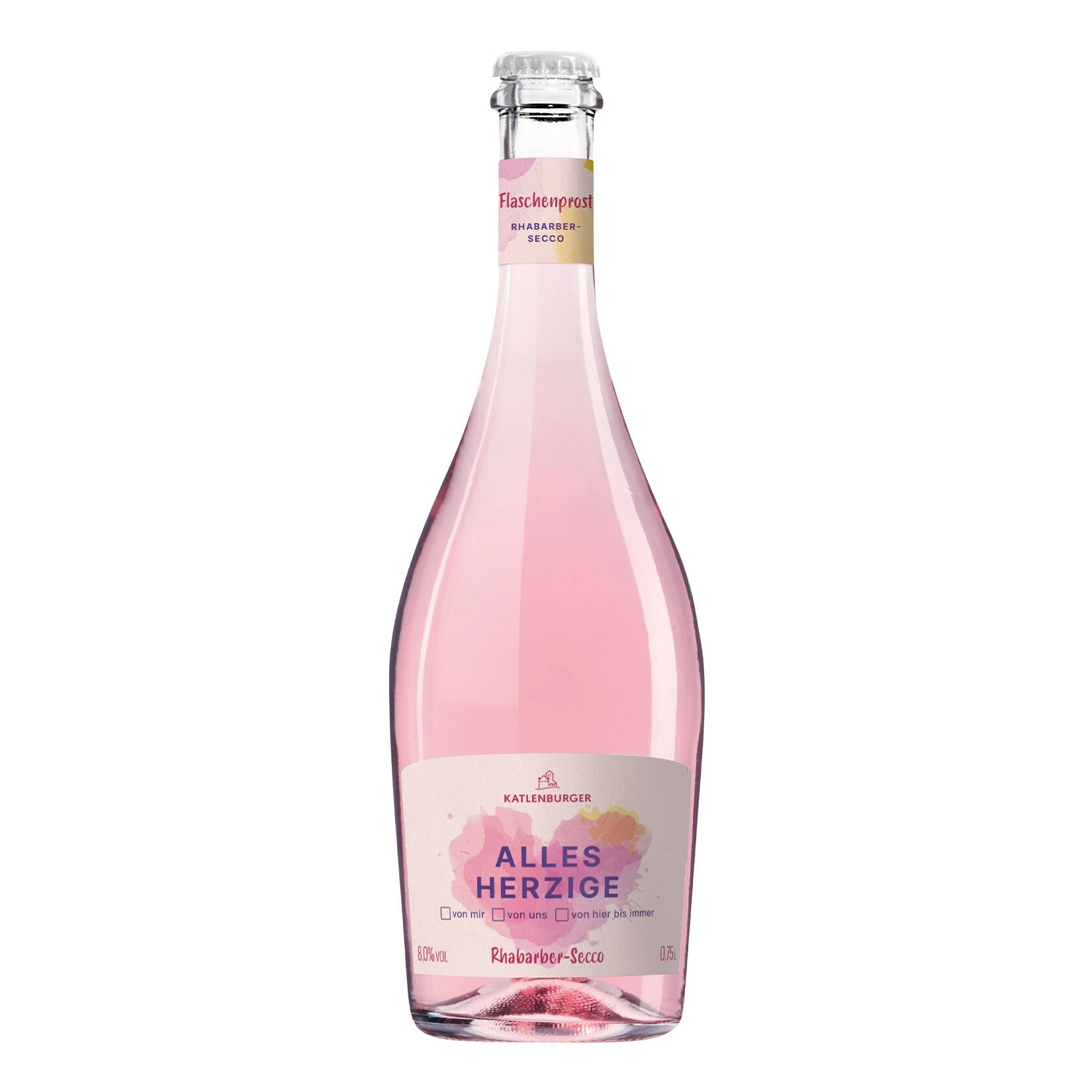 Diesen feinen Rhabarber-Secco schenkt man sehr liebenswerten Menschen oder einfach sich selbst. Sechs unterschiedliche Botschaften können durch die Ankreuzmöglichkeiten auf dem Vorderetikett individualisiert werden. Bestimme einfach selbst, wie emotional du werden möchtest. Und auf dem Rücketikett hast du die Möglichkeit zur namentlichen Personalisierung.